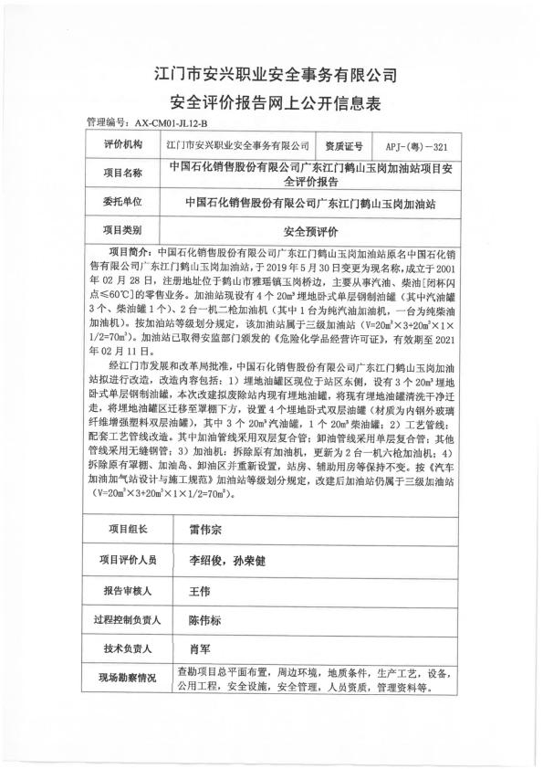 中石化广东鹤山玉岗加油站预评价