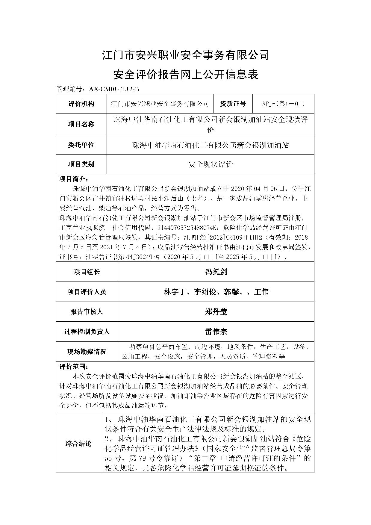 珠海中油华南石油化工有限公司新会银湖加油站公开信息